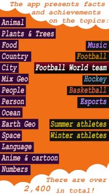 Discover a world of amazing facts about everything from the animal and plant kingdoms to the starry expanses of the universe! Enjoy learning interesting material and easily expand your knowledge anywhere and anytime, broadening your horizons and perception of the world around you! Here, everyone will find something new and exciting, whether it's entertaining facts about nature, human history, outstanding personalities, world sports records, or legendary music groups. Our quiz game brings together the most interesting and fascinating information about our world, collected in a simple and convenient mobile format especially for you: