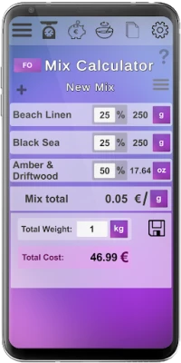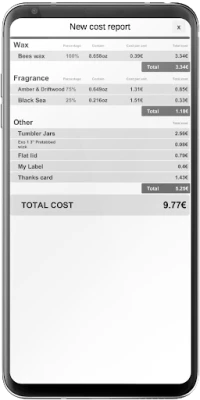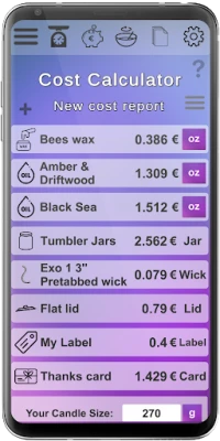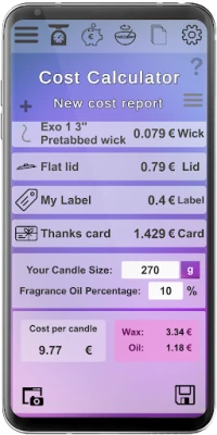 Easily calculate your candle weight for as many candles as you need. Build the total cost report of your candle by adding premade templates for any items you need using any weight or money currency , save them to your phone and load or change anytime! Calculate how much of each ingredient you need for your FO or Wax mix and how much it will cost you, make a report, save it and load or change anytime! (containing no ads, no internet connection needed, pay once and all future updates are for free)