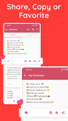 You can easily copy an IG Bio status or can also share them with your beloved ones over social network platforms. If you want to update a Bio after a week, add it to your favorites to make your private collection.
