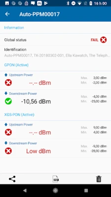 The EXFO OPM [Optical Power Meter] application can connect over Bluetooth™ to both EXFO’s PON Power meters (PPM-350D), and power checkers (MPC-100 series). When connected, the app can display live measurements and store measurements, along with the following advanced/additional features: