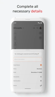 Story timeline creator provides the ability to quickly look back and navigate events and dates. This is achieved by zoom and scroll capabilities of the journal app. With just a few gestures you can easily time hop to any date or time of lifetime, which is perfect for creating your own dream journal or travel journal notebook. There is an ability to track events both in the general timeline and in other stories you've created (for example, business timeline, travel timeline, etc.).