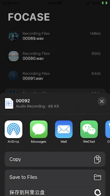FoCase Rec is an app that can view, play, store, and share recorded audio files. It does not have recording capabilities itself and needs to be used in conjunction with the FoCase hardware.